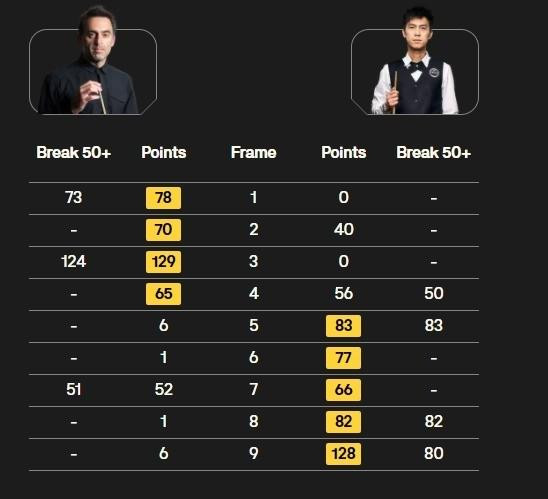 塔猜亚只大意翻袋中袋,关节还打进了 6-44,塔猜亚赓续底袋打咖啡球,稳稳射中。塔猜亚接着作念一杆斯诺克,火箭漏出中袋契机,塔猜亚稳稳打进,塔猜亚即是围着粉球打,塔猜亚还是完成超分,6-86,塔猜亚打进黑球,完成单杆破百,最终128-6拿下奥沙利文,拿下等九局,决赛第一阶段,奥沙利文先拿下四局情况下,塔猜亚连追五局,反超比分【4-5】。