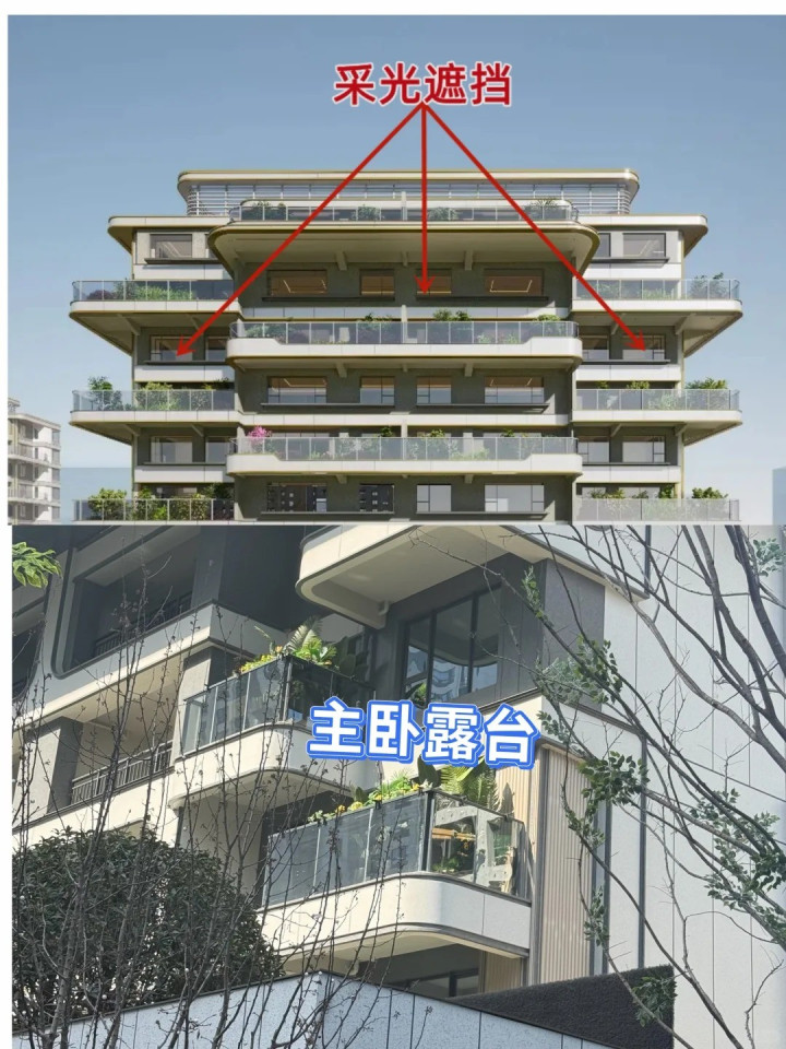 先说采光和透风。为了搞那些退台和露台,楼层之间错来错去,上头一层凸出来一块,底下一层又缩进去少许。