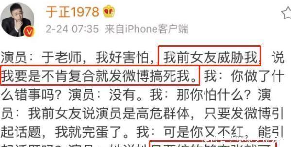 2019年2月24日,于正在微博上共享了与我方旗下男演员的聊天纪录。从中不错看出,于正收到了别称艺东说念主的乞助信息。
