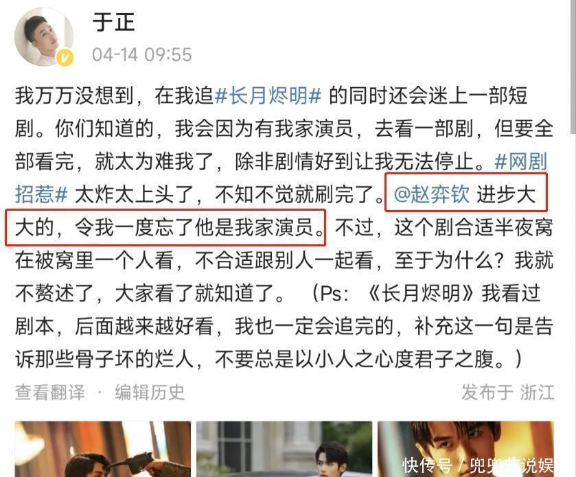 最近,赵弈钦主演的网剧《招惹》刚完了,导演于正在微博上为他旗下的男演员赵弈钦加油。