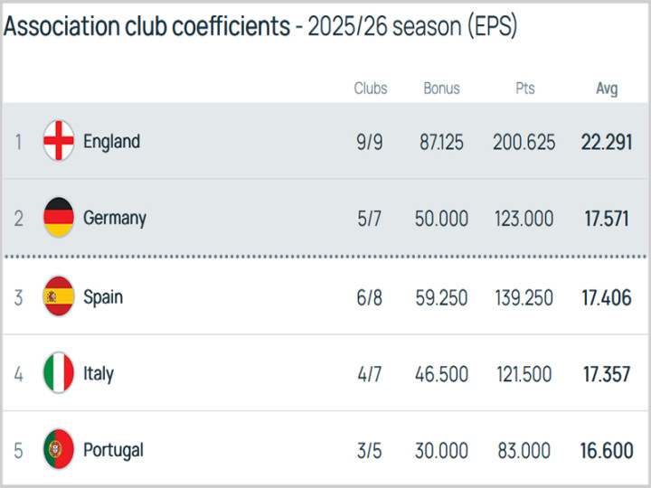 附加赛启动之前,凭证欧洲联赛积分榜,英超遥遥进步,比第二名的德甲多出5分以上,葡超排在第三名,随后是西甲和意甲。两轮附加赛适度后,欧洲联赛积分发生不小变化,由于本菲卡两场失利,葡超莫得球队需要参预欧联杯和欧协联附加赛,无法增多任何积分,照旧退居第5名,剩下葡萄牙体育、波尔图和布拉加3队,肯定很难大幅进步积分。