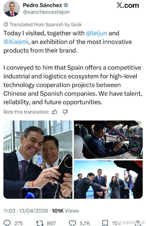 #西班牙首相试坐小米汽车#本尊我方发了外网X官号。