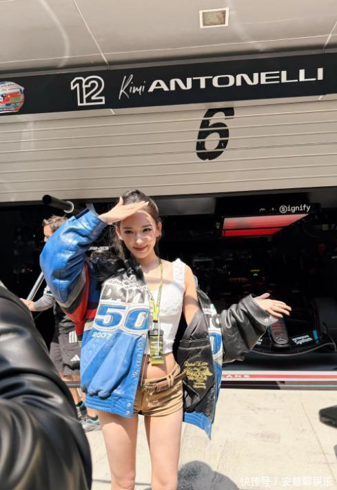 三月初,上海的F1赛场上,她身穿蓝白拼色的短款赛车夹克,搭配光亮的短裙,马尾高高扎起,荧光发带点缀,竟然利落又酷炫。