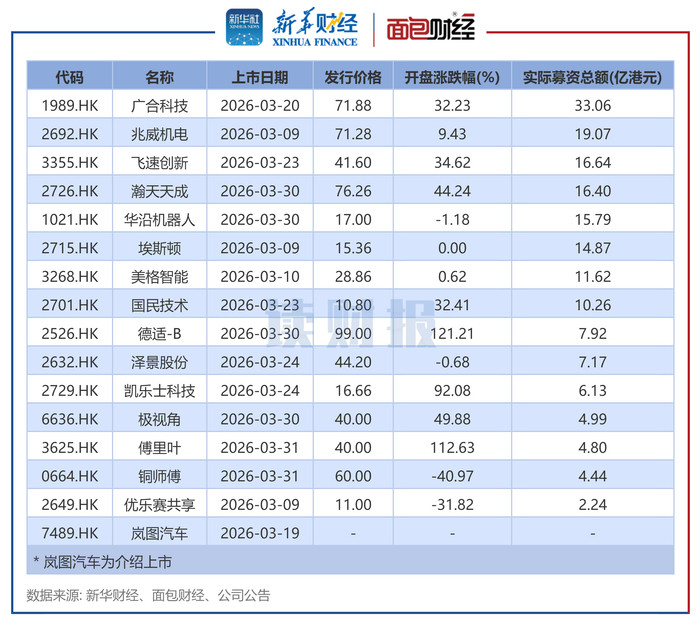 3月上市新股中,广合科技募资总数达33.06亿港元,界限最大。兆威机电、速即翻新、瀚天天成、华沿机器东说念主募资跳动15亿港元。