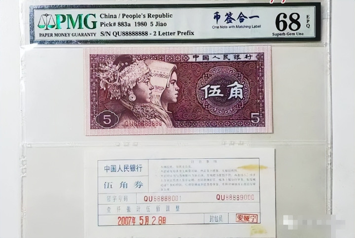 这张1980年的5角纸币,评分是68分,它的活水号是八同八的麒麟号。像这样的纸币,储藏价钱大要达到35600元傍边。