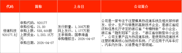 港股方面,Wind数据浮现,本周(4月7日至4月10日)暂无新股申购安排。
