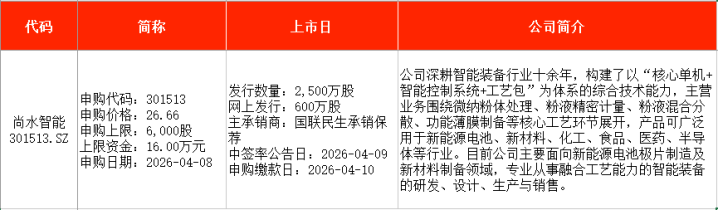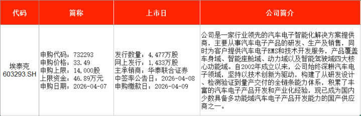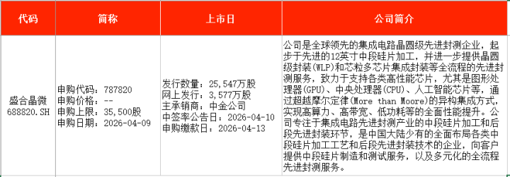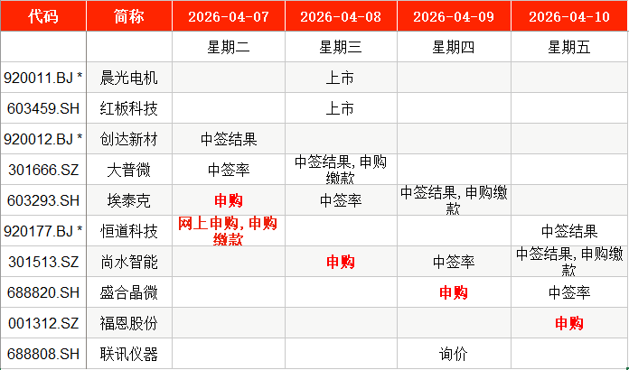 从时分表看,埃泰克(603293)、恒说念科技(920177)在本周二(4月7日)申购,尚水智能(301513)将在本周三(4月8日)申购,盛合晶微(688820)将在本周四(4月9日)申购,福恩股份(001312)则在本周五(4月10日)申购。