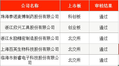 其中,拟在科创板上市的珠海泰诺麦博制药股份有限公司(下称“泰诺麦博”),拟在创业板上市的浙江欣兴器用股份有限公司(下称“欣兴器用”),以及拟在北交所上市的浙江永励精密制造股份有限公司(下称“永励精密”)、上海百英生物科技股份有限公司(下称“百英生物”)、临海市新睿电子科技股份有限公司(下称“新睿电子”)等均到手过会。
