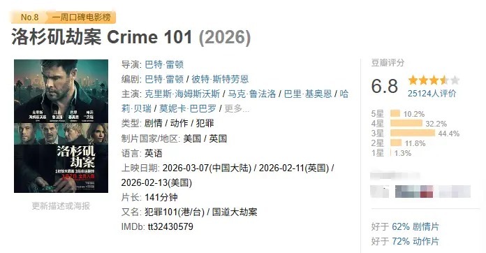 上周院线片主要看好莱坞,两部新上映的好莱坞院线片的质料齐挺可以,豆瓣评分也齐不低。