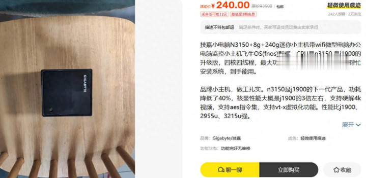 刚刚在二手鱼里瞎逛,短暂刷到一台技嘉的小电脑,卖家标价240元起。CPU是N3150,救济装配飞牛和黑群晖。卖家说N3150是J1900的升级版,四核四线程,最大功耗才6W,平素使用也就3W驾御,用来作念nas性能够用况兼还省电。